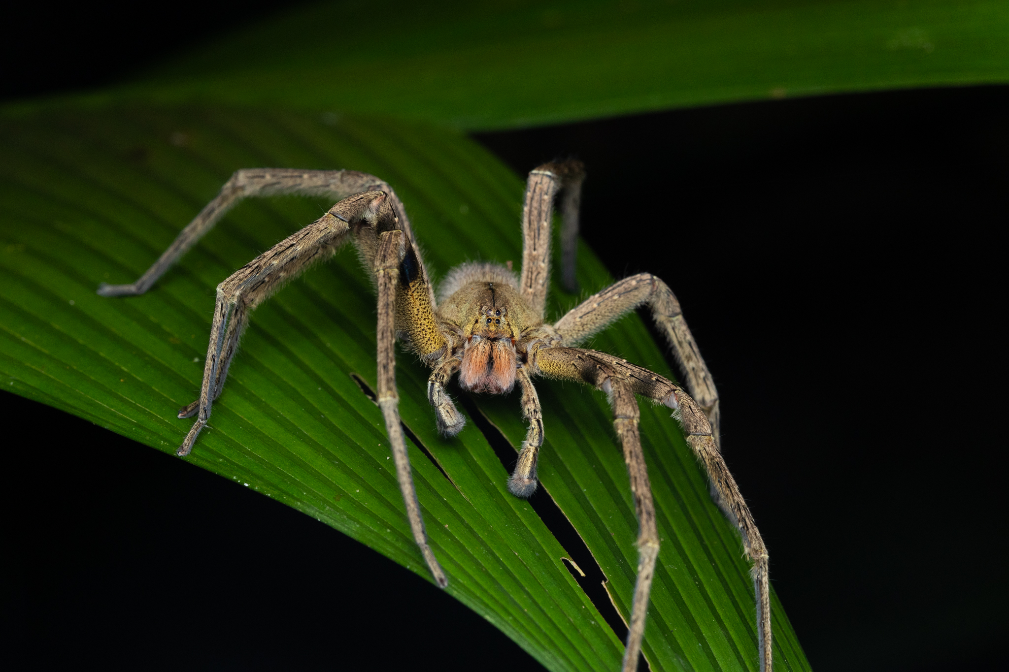 Butterflies come in a bewildering array of colours and sizes, and will be found wherever there are flowers, which is pretty much everywhere. However, they present a real challenge to photograph. For a more compliant subject, there’s the ultra-common golden silk orb-weaver spider sitting motionless its enormous web. It’s quite a beautifully marked spider with yellow spots on a dark olive green body. However, to get a feel for the true size and diversity of the spider population, wait until it gets dark and head out into the garden of your hotel or lodge with a torch and camera flash.  You may be surprised, perhaps a little alarmed, by the sheer number and size of the spiders that festoon the bromeliads after dark.  Among them, wandering spiders are particularly striking: chunky, long-legged, with large eyes and a covering of fine hairs that make them excellent macro subjects. They’re not easily spooked, but be sure not to antagonise them as they are highly venomous and can be aggressive when defending themselves.  If you’re lucky, you’ll get to see tarantulas, but my experience was that they are generally quite skittish and disappear down their burrows at the first sign of a camera.