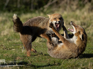 Generally, relationships within the family are very amicable but on rare occasions, squabbles can break out over the supplemental food I provide if it's not been distributed widely enough. While these squabbles are always dramatic and noisy, with teeth bared, it is all threat and no actual harm is done. On the rare occasions it's happened, it always starts off the same with ears flattened and tails wagging. This escalates into a game of pushing and shoving using their rumps, which can become quite comical as one or both foxes get their rear ends lifted into the air while still trying to eat. If this doesn't resolve the issue, one will try to dominate the other by mounting them, which usually results in the less dominant fox flipping onto its back in dramatic fashion with legs kicking out and brilliantly white teeth displayed in gaping mouths. In a matter of a few seconds, probably less than five, the scuffle is over and the pecking order is re-established.
