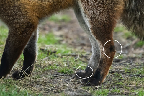 Distinguishing features: Quite a deep red coat with a white tip to his tail. He has dark tear stripes and a single dark scar on the centre of his muzzle, near his nose. He has a white spot on his otherwise black right-rear foot, and a dark patch just above his left hock (ankle).